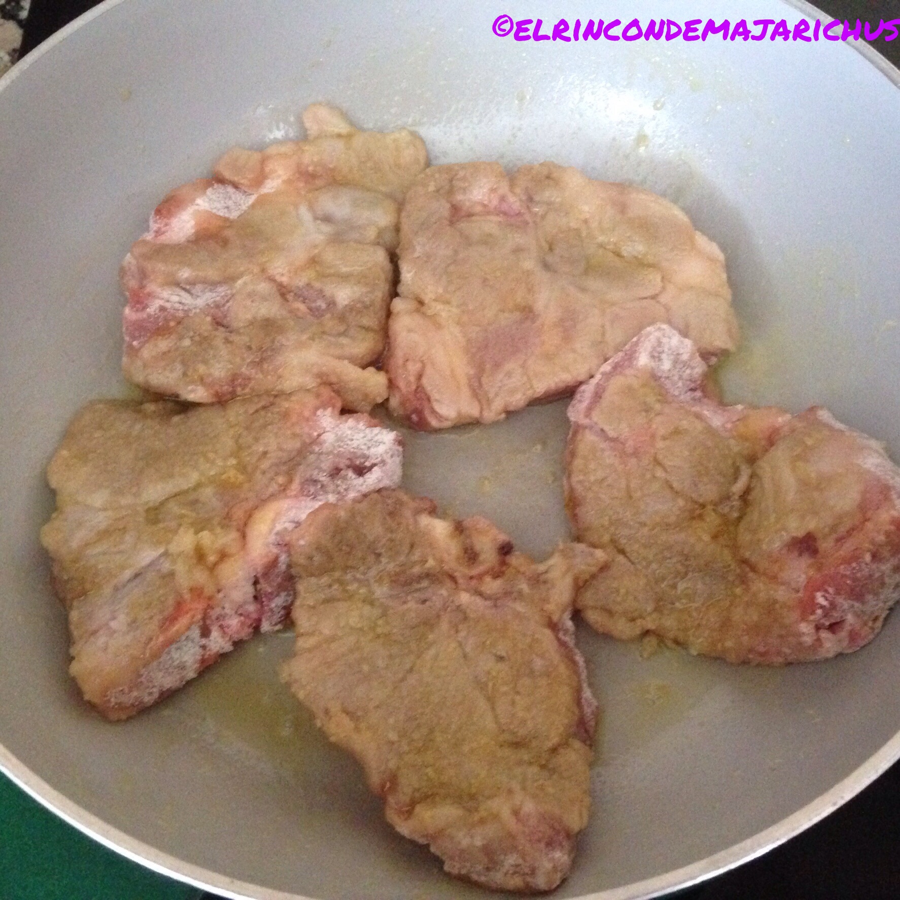 Salpimentamos las chuletillas, las enharinamos y las doramos en una sartén con aceite. Las retiramos y reservamos.
