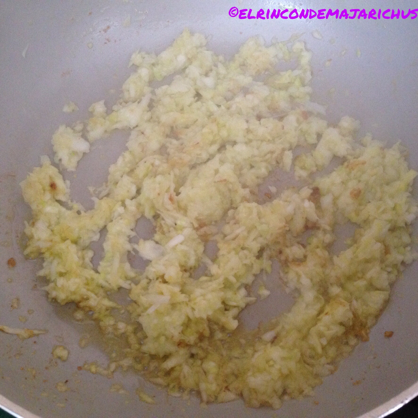 En el mismo aceite, doramos las cebolletas y el puerro, finamente picados. Añadimos las pasas y las dejamos unos minutos a fuego medio.