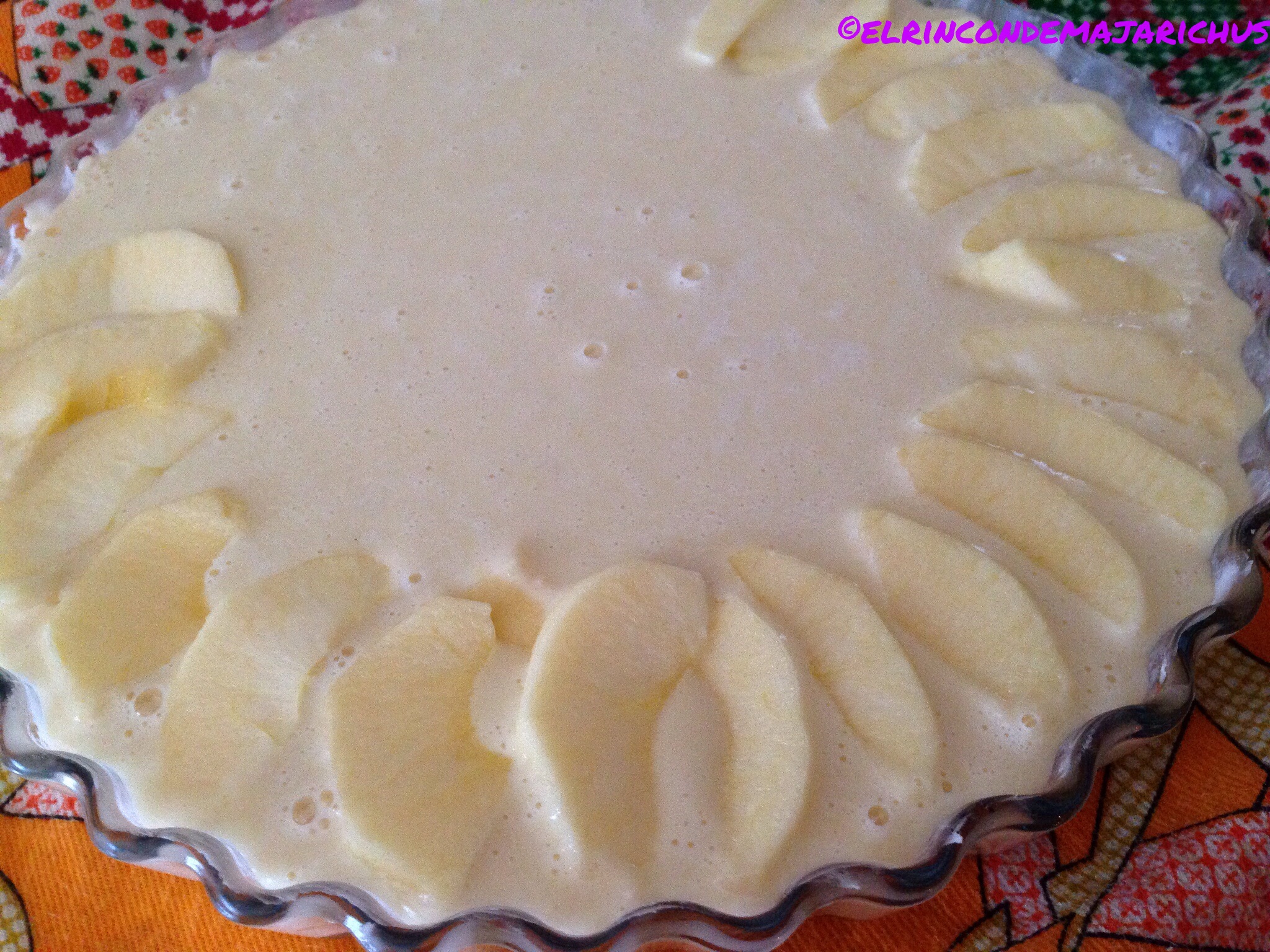 Vertemos esta mezcla en un molde untado con mantequilla, y adornamos con las dos manzanas cortadas.