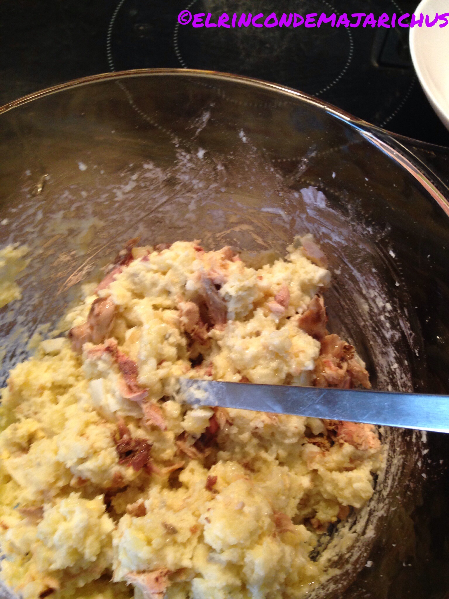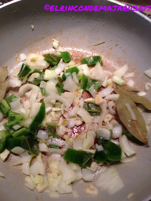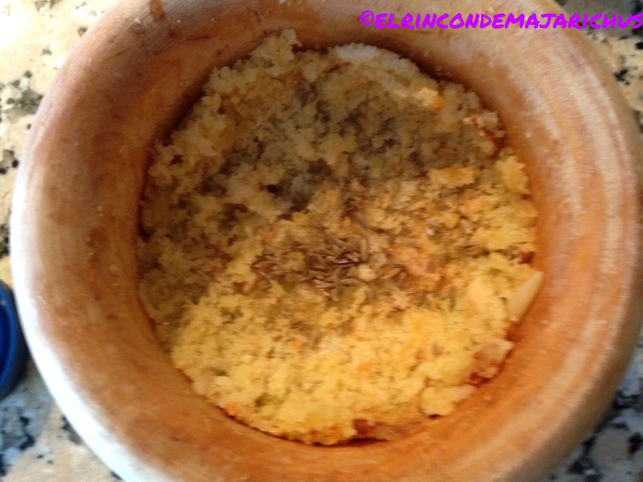 En aceite de oliva se fríen los ajos y las rebanadas de pan. Una vez frito echamos los ajos y un poco de sal al mortero y vamos machacando, echamos el pan y machacamos, se les añade el comino, y el pimentón, y lo mezclamos todo. Se echa un poco de agua y se remueve, reservamos.