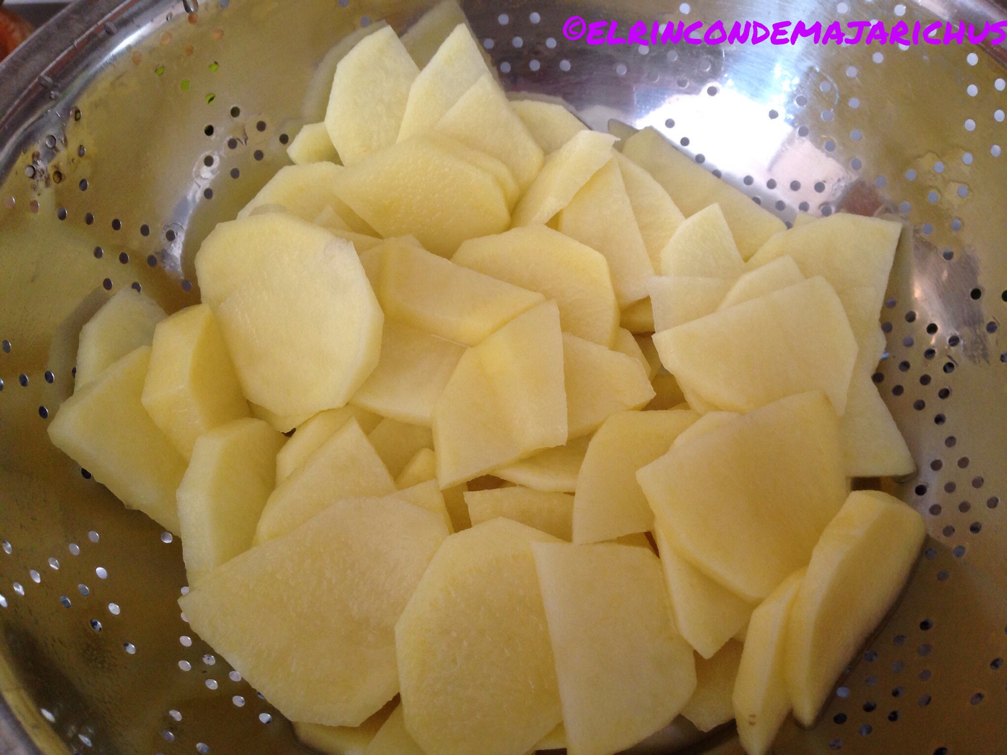 Si queremos que el plato sea más contundente, o para toda la familia, pelamos las patatas y las partimos finitas en rodajas, y las añadimos al guiso.